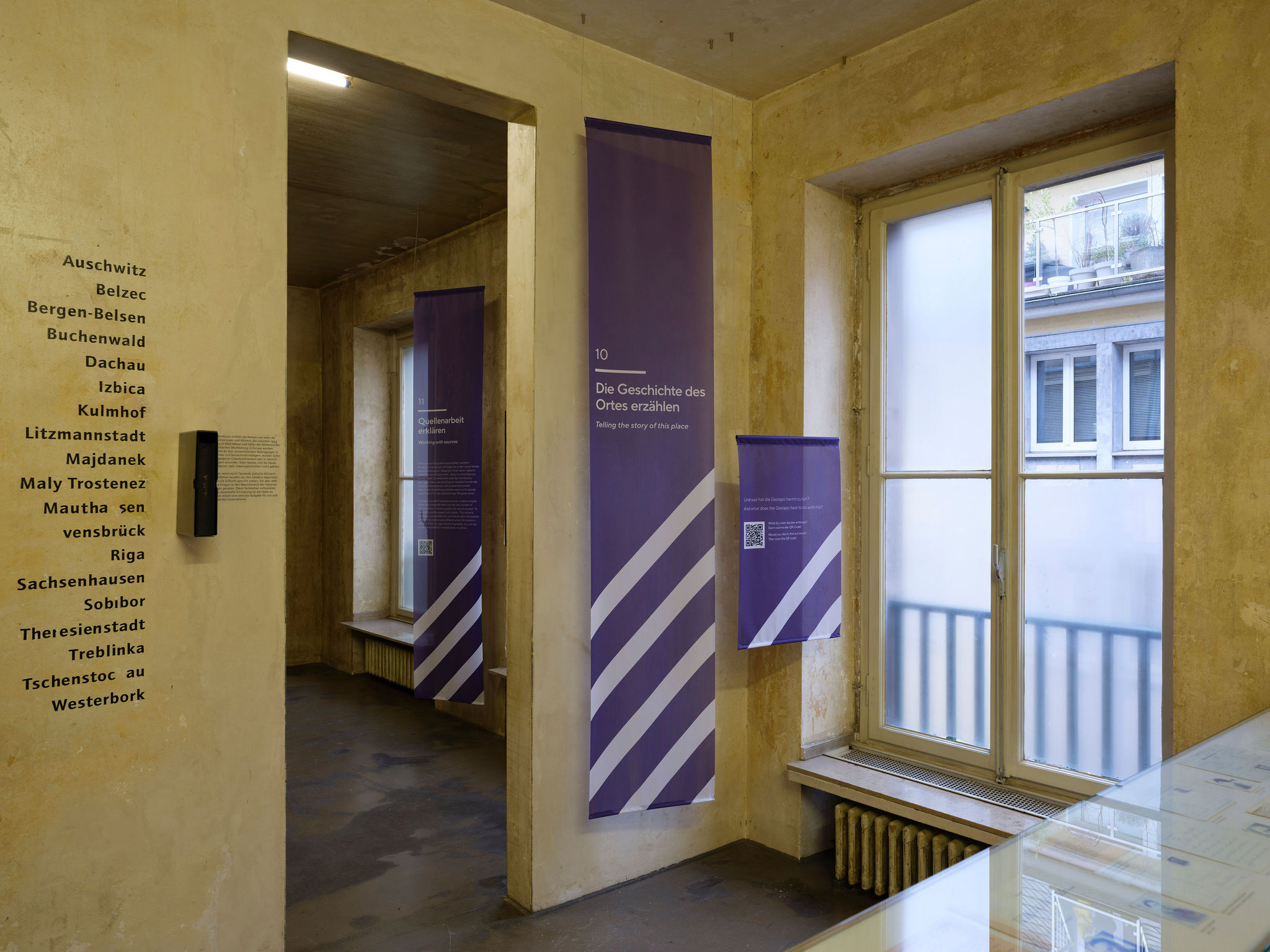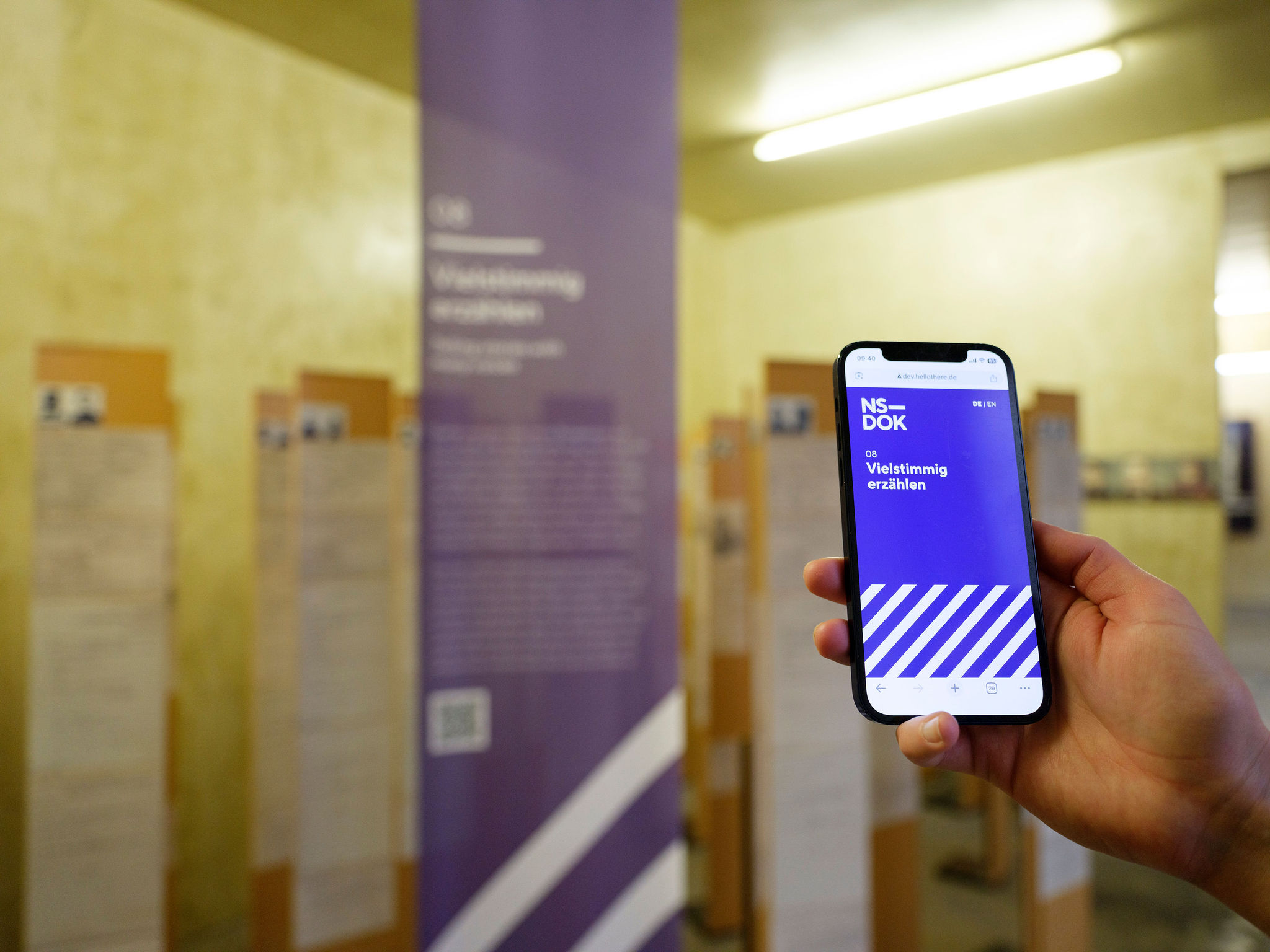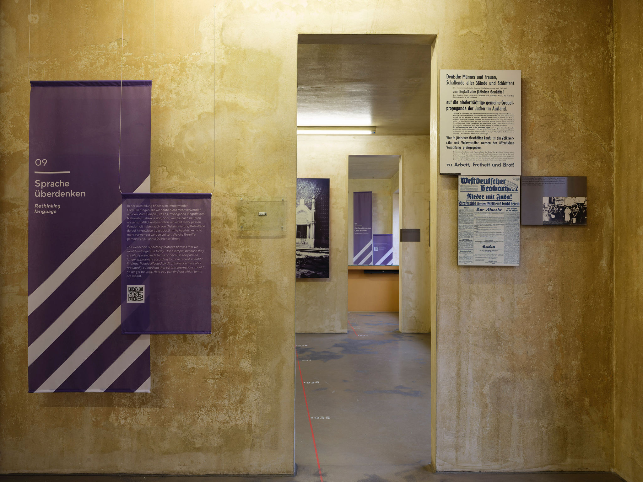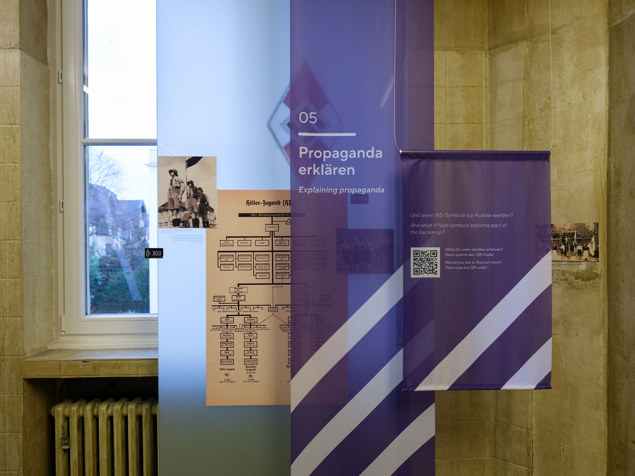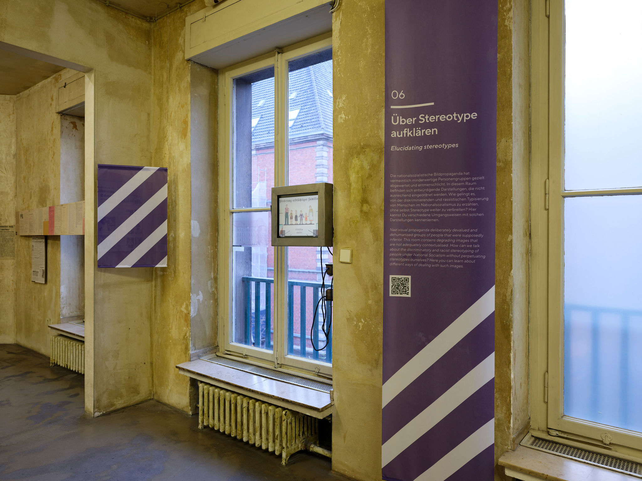 Ausgangspunkte der Intervention sind einzelne Exponate, Texte oder Präsentationsformen, die heute kritisch gesehen werden können. Gemeinsam mit den Besucher*innen sollen so exemplarisch allgemeinere Fragen diskutiert werden, die sich aktuell beim Ausstellen von NS-Geschichte stellen: etwa zum Umgang mit propagandistischen Quellen oder mit dem historischen Ort, aber auch an Stellen, wo in der Ausstellung Stereotype bedient – oder gerade junge Besucher*innen ohne Vorwarnung mit extremen Gewaltdarstellungen konfrontiert werden. Möglich wird das durch QR-Codes, die die Besucher*innen über ihre Smartphones scannen, um dann an zwölf Stationen Informationen u.a. über den aktuellen Stand der NS-Forschung und Diskussionen des Ausstellungsmachens zu erhalten. Die Besucher*innen sind zugleich eingeladen, ihre eigenen Positionen einzubringen. Dank farbiger Stoffbanner, die von der Decke hängen, ist schon von Weitem zu erkennen, wo das Haus ein Thema neu bewertet.
